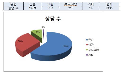 2013³â 1¿ùºÎÅÍ 6¿ù±îÁö »óÁ¶È¸»ç ÇÇÇØ·Î ¼ÒºñÀÚ»ó´ã¼¾ÅÍ ¹× ÀÚÀ²ºÐÀïÁ¶Á¤À§¿øÈ¸¿¡ Á¢¼öµÈ »ç·Ê Áß ÇØ¾àȯ±Þ±Ý¿¡ °üÇÑ »ó´ãÀÌ 2,435°ÇÀ¸·Î ¾à 90%¸¦ Â÷ÁöÇß´Ù.