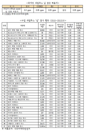 ±è¿ëÀÍ ÀÇ¿ø½ÇÀÌ ½ÄǰÀǾàǰ¾ÈÀüó·ÎºÎÅÍ Á¦Ãâ¹ÞÀº ¡®¼öÀÔ °úÀÏÁÖ½º ³³ °Ë»ç ÇöȲ¡¯¿¡ µû¸£¸é, 2010³âºÎÅÍ ¿ÃÇØ 9¿ù±îÁö ±¹Á¦±âÁØÄ¡(CODEX) 0.05ppmÀ» ÃʰúÇÑ 37°Ç, 327ÅæÀÇ °úÀÏÁÖ½º°¡ ±¹³»¿¡ ¼öÀÔ¡¤À¯ÅëµÈ °ÍÀ¸·Î È®ÀεƴÙ. ¿ì¸®³ª¶ó °úÀÏÁÖ½º ³³ Çã¿ë ±âÁØÄ¡´Â ±¹Á¦±âÁØÄ¡º¸´Ù 6¹è ³ôÀº 0.3ppmÀ̶ó´Â ÀÌÀ¯·Î ÇØ´ç Á¦Ç°µéÀº ¸ðµÎ ÀûÇÕ ÆÇÁ¤À» ¹Þ°í ±¹³»·Î ¼öÀԵƴÙ.