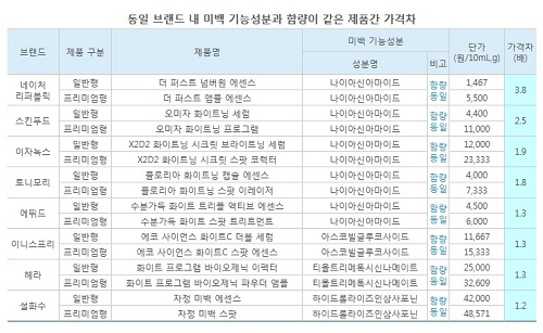 ÀÌ º¸°í¼­¿¡ µû¸£¸é, Á¶»ç ´ë»ó 15°³»ç Áß ³×ÀÌó¸®ÆÛºí¸¯(3.8¹è), ½ºÅ²Çªµå(2.5¹è), Åä´Ï¸ð¸®(1.8¹è) µî ÁßÀú°¡·Î ºÐ·ùµÇ´Â È­Àåǰºê·£µå¼óÀÇ ÇÁ¸®¹Ì¾ö Á¦Ç°°ú ÀϹÝÁ¦Ç°ÀÇ °¡°Ý Â÷À̰¡ Àû°Ô´Â 1.3¹è¿¡¼­ ¸¹°Ô´Â 4¹è °¡±îÀÌ Â÷À̰¡ ³µÀ¸³ª. ¼ººÐÀº ÀϹÝÁ¦Ç°°ú µ¿ÀÏÇÑ ¼öÁØÀÎ °ÍÀ¸·Î ³ªÅ¸³µ´Ù.