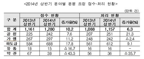 2014³â »ó¹Ý±â Á¢¼ö °Ç¼ö´Â 1,280°ÇÀ¸·Î Àü³â(1,161°Ç)º¸´Ù 119°ÇÀÌ Áõ°¡(10.2%)Çß°í, ó¸® °Ç¼ö´Â 1,157°ÇÀ¸·Î Àü³â(1,088°Ç)º¸´Ù 69°ÇÀÌ Áõ°¡(6.3%)Çß´Ù. ¹ý¿ø ¿¬°è Á¶Á¤ »ç°ÇÀº ÃÑ 70°ÇÀÌ Á¢¼öµÆÀ¸¸ç, ÀÌ Áß 19°³ »ç°ÇÀÌ Ã³¸®µÆ´Ù.