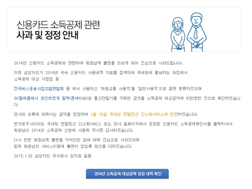 ÀÌ¿¡ »ï¼ºÄ«µå ÇÑ °ü°èÀÚ´Â ¡°Áö³­ÇØ ¹Ì ¹Ý¿µµÈ ¼Òµæ°øÁ¦ ´ë»ó±Ý¾×Àº Á¤Á¤ÇØ 26ÀÏ ±¹¼¼Ã» ¿¬¸»Á¤»ê °£¼ÒÈ­¼­ºñ½º¿¡ Àϰý ¹Ý¿µÇß´Ù¡±¸é¼­ ¡°´ë»ó °í°´¿¡ ´ëÇØ¼­´Â »ï¼ºÄ«µå ȨÆäÀÌÁö µîÀ» ÅëÇØ ¾Ë¸®°í, ȨÆäÀÌÁö¿¡¼­µµ È®ÀÎÇÒ ¼ö ÀÖ°Ô Çß´Ù¡±°í ¹àÇû´Ù. »Ó¸¸ ¾Æ´Ï¶ó 2013³â ¹Ì ¹Ý¿µµÈ ¼Òµæ°øÁ¦ ´ë»ó±Ý¾×¿¡ ´ëÇØ¼­´Â ºü¸¥ ½ÃÀÏ ³»¿¡ ÇØ´ç °í°´¿¡°Ô ¾Ë·Á ÇÇÇØ°¡ ¾øµµ·Ï ÃÖ¼±À» ´ÙÇÏ°Ú´Ù°í µ¡ºÙ¿´´Ù.