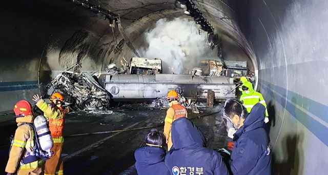 ¾Õ¼­ Àü³¯ ³· 12½Ã 23ºÐÂë ÀüºÏ ³²¿ø½Ã »ç¸Å¸é °è¼ö¸® ¼øÃµ~¿ÏÁÖ °í¼Óµµ·Î »óÇ༱ ³²¿ø »ç¸Å2ÅͳΠ¾È 100m ÁöÁ¡¿¡¼­ 24t ÅÊÅ©·Î¸®¿Í Æ®·¹ÀÏ·¯, È­¹°Â÷·® µî 30¿©´ë°¡ ÀÕµû¶ó Ãßµ¹Çß´Ù. °ø°³µÈ µµ·Î°ø»ç Æó¼âȸ·Î(CC)TV ¿µ»ó¿¡ µû¸£¸é »ç°í ´ç½Ã ÅͳΠ¾È¿¡´Â ºùÆÇ±æ¿¡ ¹Ì²ô·¯Áø Â÷·® 6~7´ë°¡ 1¤ý2Â÷·Î¿¡ µÚ¾ûŲ ¸ð½ÀÀÌ Æ÷ÂøµÈ´Ù. ÀÌÈÄ ÅͳΠ2Â÷·Î¸¦ ´Þ¸®´ø 24t ÅÊÅ©·Î¸®°¡ ¼Óµµ¸¦ ÁÙÀÌÁö ¸øÇÏ°í ¾Õ¿¡ ÀÖ´ø Æ®·¹ÀÏ·¯¿Í ÀÕ´Þ¾Æ ºÎµúÈ÷¸ç Å«ºÒÀÌ ³ª´Â ¸ð½ÀÀÌ ¿µ»ó¿¡¼­ °üÂûµÈ´Ù. ƯÈ÷ »ç°í°¡ ³­ ÅÊÅ©·Î¸®¿¡´Â Áú»ê 1¸¸8000L°¡ ½Ç·Á ÀÖ¾ú°í »ç°í Ãæ°ÝÀ¸·Î ºÒÀÌ ºÙÀ¸¸é¼­ ÅͳΠ¾ÈÀÌ À¯µ¶°¡½º·Î °¡µæÂ÷ ¼Ò¹æÂ÷ ÁøÀÔ µî¿¡ Å« ¾î·Á¿òÀ» °Þ¾ú´Ù.
