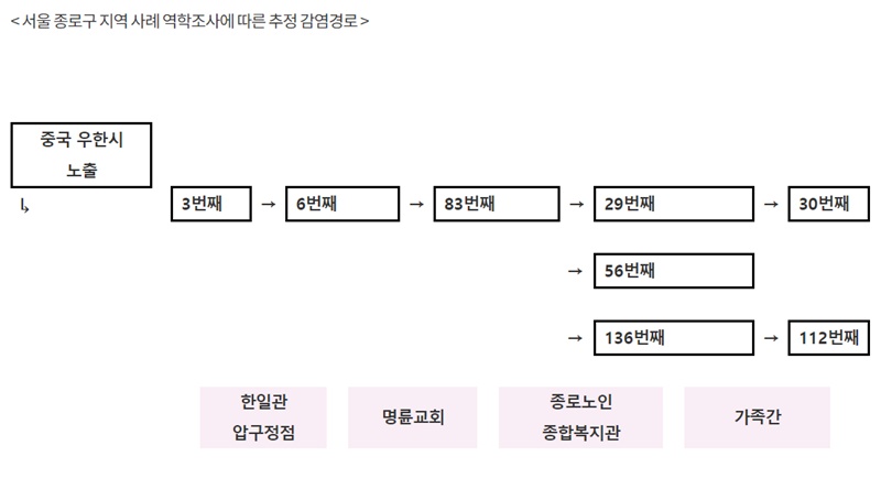 °¢ ȯÀÚµéÀÇ Áõ»ó ¹ßÇöÀÏÀ» °í·ÁÇϸé 29¹øÂ° ȯÀÚ(2¿ù 5ÀÏ ¹ßÇö)¿Í 56¹øÂ° ȯÀÚ(2¿ù 5ÀÏ°æ ¹ßÇö), 136¹øÂ° ȯÀÚ(2¿ù 1ÀÏ°æ ¹ßÇö)´Â Á¾·Î³ëÀÎÁ¾ÇÕº¹Áö°ü¿¡¼­ 83¹øÂ° ȯÀÚ¿¡°Ô °¨¿°µÇ¾úÀ» °ÍÀ¸·Î ÃßÁ¤Çϰí ÀÖ´Ù.