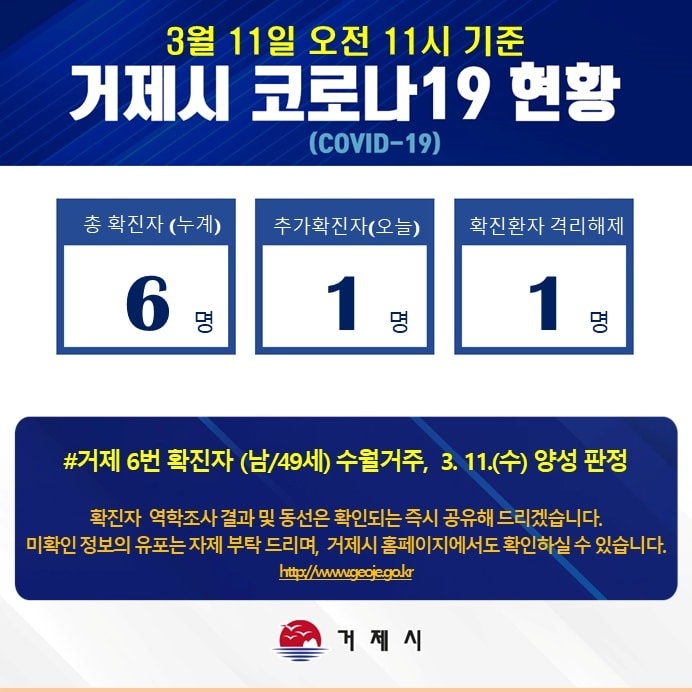 °ÅÁ¦-6¹ø È®ÁøÀÚ°¡ ¹ß»ýÇÔ¿¡ µû¶ó ÇöÀç±îÁö ÃÑ È®ÁøÀÚ´Â 6¸íÀ̸ç, È®Áø ȯÀÚ Áß 1¸íÀº °Ý¸® ÇØÁ¦µÆ´Ù.