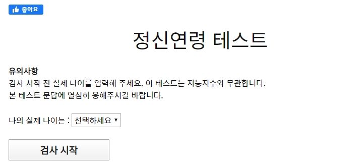 Á¤½Å¿¬·É Å×½ºÆ®´Â ȨÆäÀÌÁö¿¡ Á¢¼ÓÇÏ¸é ½ÇÁ¦ º»ÀÎÀÇ ³ªÀ̸¦ ¼±ÅÃÇÑ ÈÄ, 4ÆäÀÌÁö·Î ±¸¼ºµÈ Áú¹®¿¡ ´äÀ» ÀÔ·ÂÇϸé Á¤½Å¿¬·ÉÀ» ¾Ë·ÁÁØ´Ù.