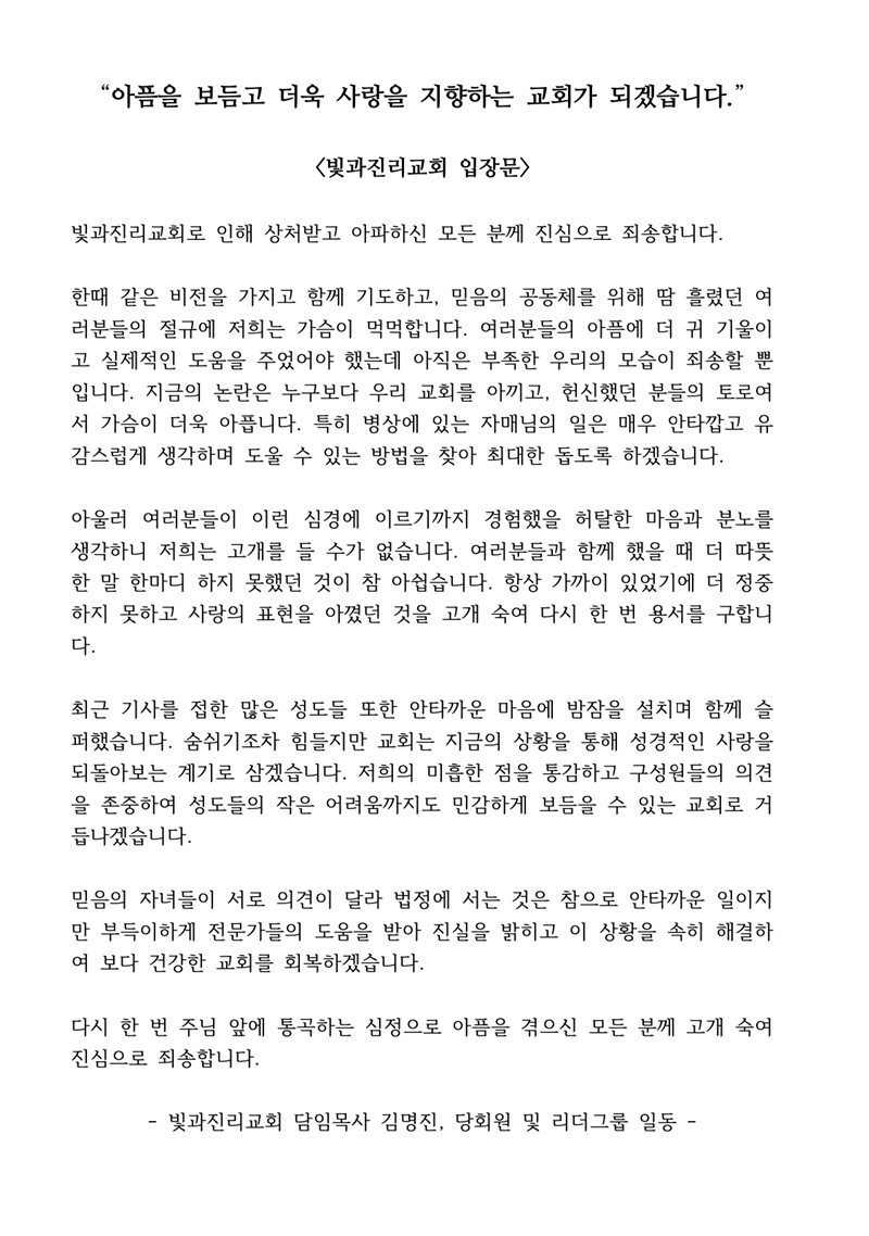 5ÀÏ ¡®ºû°úÁø¸®±³È¸ ´ãÀÓ¸ñ»ç ±è¸íÁø, ´çȸ¿ø ¹× ¸®´õ±×·ì Àϵ¿¡¯À̶ó´Â ¸»·Î ¸ÎÀº ÀÔÀå¹®Àº ¡°¾ÆÇÄÀ» º¸µë°í ´õ¿í »ç¶ûÀ» ÁöÇâÇÏ´Â ±³È¸°¡ µÇ°Ú½À´Ï´Ù¡±¶ó´Â Á¦¸ñÀ¸·Î º´»ó¿¡ ÀÖ´Â ÀÌ¿¡°Ô ¡°¾ÈŸ±õ°í À¯°¨½º·´°Ô¡±¶ó´Â ȸÇǼº Ç¥ÇöÀ» ½á ºÐ³ë¸¦ ´õ¿í Ű¿ì°í ÀÖ´Ù.
