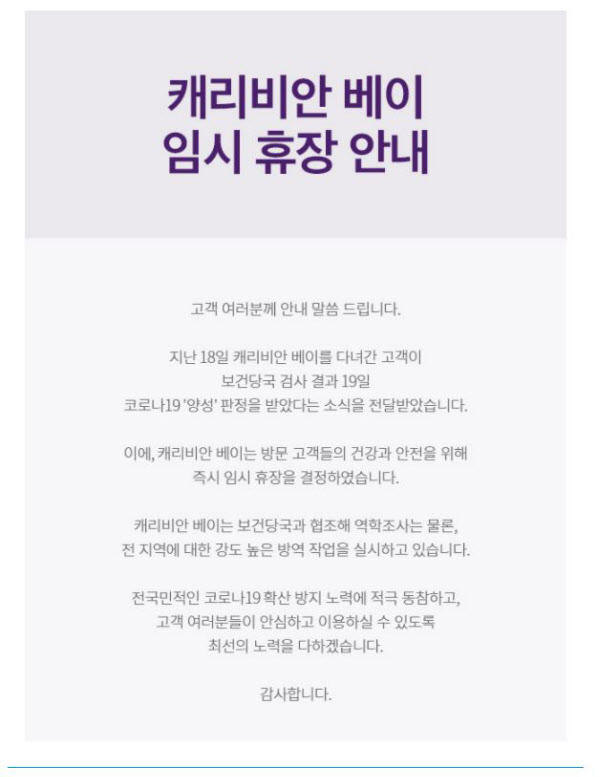 19ÀÏ Ä³¸®ºñ¾È º£ÀÌ´Â °øÁö¹®À» ÅëÇØ ¡°Áö³­ 18ÀÏ Ä³¸®ºñ¾È º£À̸¦ ´Ù³à°£ °í°´ÀÌ º¸°Ç´ç±¹ °Ë»ç °á°ú ¿À´Ã Äڷγª19 ¾ç¼º ÆÇÁ¤À» ¹Þ¾Ò´Ù¡±°í ¹àÇû´Ù.