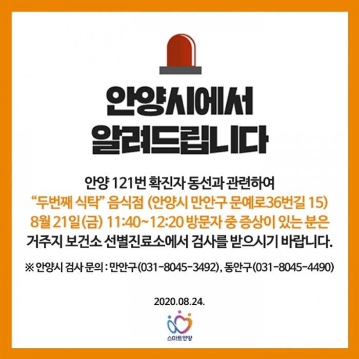 ¾È¾ç½ÃûÀº 24ÀÏ °ø½Ä SNS¸¦ ÅëÇØ ¡°¡®µÎ¹øÂ° ½ÄŹ¡¯ À½½ÄÁ¡ (¾È¾ç½Ã ¸¸¾È±¸ ¹®¿¹·Î 36¹ø±æ15) 8.21.(±Ý) 11:40~12:20 ¹æ¹®ÀÚ Áß Áõ»óÀÌ ÀÖ´Â ºÐÀº °ÅÁÖÁö º¸°Ç¼Ò ¼±º°Áø·á¼Ò¿¡¼­ °Ë»ç¸¦ ¹ÞÀ¸½Ã±â ¹Ù¶ø´Ï´Ù¡±¶ó°í °øÁöÇß´Ù.