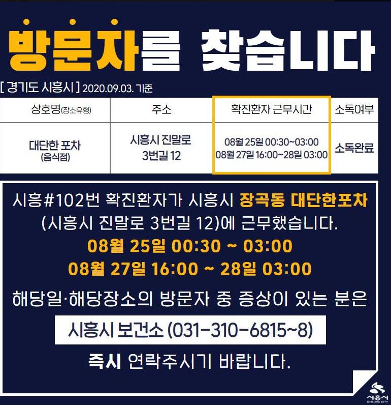 ½ÃÈï½ÃûÀº 3ÀÏ °ø½Ä SNS¸¦ ÅëÇØ ¡°½ÃÈï 102¹ø È®ÁøÈ¯ÀÚ°¡ ½ÃÈï½Ã Àå°îµ¿ ´ë´ÜÇÑÆ÷Â÷(°æ±âµµ ½ÃÈï½Ã Áø¸»·Î 3¹ø±æ12)¿¡ ±Ù¹«Çß´Ù. 8¿ù 25ÀÏ 0½Ã 30ºÐºÎÅÍ ¿ÀÀü 3½Ã±îÁö, Áö³´Þ 27ÀÏ ¿ÀÈÄ 4½ÃºÎÅÍ 28ÀÏ ¿ÀÀü 3½Ã±îÁö ÇØ´ç ÀÏ, ÇØ´çÀå¼ÒÀÇ ¹æ¹®ÀÚ Áß Áõ»óÀÌ ÀÖ´Â ºÐÀº ½ÃÈï½Ã º¸°Ç¼Ò¿¡ Áï½Ã ¿¬¶ôÁֽñ⠹ٶõ´Ù¡±¶ó°í °øÁöÇß´Ù.