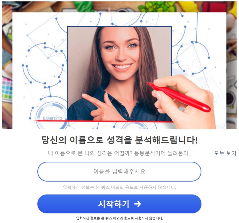 ¡®³» À̸§ ºÐ¼®¡¯À» °Ë»ö ÈÄ ºÀºÀ »çÀÌÆ®¿¡ Á¢¼ÓÇÏ¸é ¡®´ç½ÅÀÇ À̸§À¸·Î ¼º°ÝÀ» ºÐ¼®Çص帳´Ï´Ù¡¯¶ó´Â ¹®±¸°¡ ³ª¿À°í ¡®À̸§À» ÀÔ·ÂÇØÁÖ¼¼¿ä¡¯¶ó´Â °ø¶õÀÌ ³ª¿Â´Ù. ÇØ´ç °ø¶õ¿¡ À̸§À» ÀÔ·ÂÇÏ¸é °á°ú°¡ ³ª¿Â´Ù.