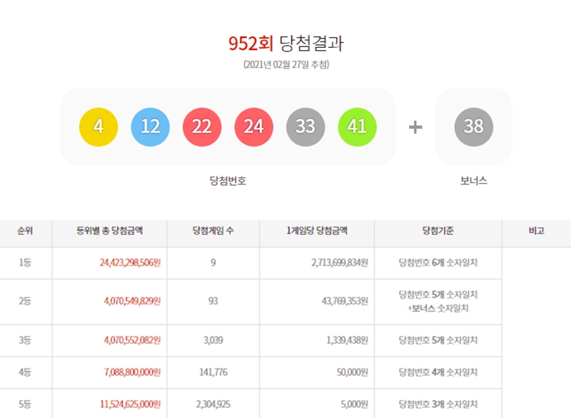 27ÀÏ µ¿Çູ±Ç ÃøÀÌ ¹ßÇ¥ÇÑ 952ȸ ·Î¶Ç ´ç÷¹øÈ£´Â '4, 12, 22, 24, 33, 41'ÀÌ´Ù. º¸³Ê½º ¹øÈ£´Â '38'ÀÌ´Ù.