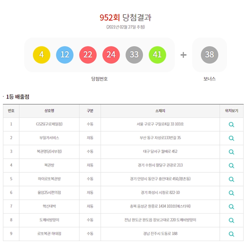 27ÀÏ µ¿Çູ±Ç ÃøÀÌ ¹ßÇ¥ÇÑ 952ȸ ·Î¶Ç ´ç÷¹øÈ£´Â '4, 12, 22, 24, 33, 41'ÀÌ´Ù. 2µî º¸³Ê½º ¹øÈ£´Â '38'ÀÌ´Ù.