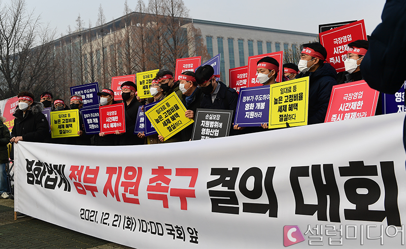 Çѱ¹»ó¿µ°üÇùȸ¸¦ ºñ·ÔÇØ °¢ ±ØÀå»ç, Çѱ¹¿µÈ­ÇÁ·Îµà¼­Á¶ÇÕ, ¼öÀÔ¹è±Þ»çÇùȸ µî ¿µÈ­´Üü ¼Ò¼Ó ¿µÈ­ÀεéÀº 21ÀÏ ¿ÀÀü 10½Ã ¿©Àǵµ ±¹È¸ÀÇ»ç´ç ¾Õ¿¡ ¸ð¿© ¡®¿µÈ­¾÷°è Á¤ºÎÁö¿ø È£¼Ò °áÀÇ ´ëȸ¡¯¸¦ °³ÃÖÇß´Ù. ÀÌ ÀÚ¸®¿¡´Â À§Å¹ ±ØÀåÀ» ¿î¿µÇÏ´Â ±ØÀåÁÖ¿Í ¿µÈ­°ü »ó±Ç¿¡¼­ »ó°¡¸¦ ¿î¿µÇÏ´Â Áö¿ª ¼Ò»ó°øÀε鵵 Âü¼®Çß´Ù.