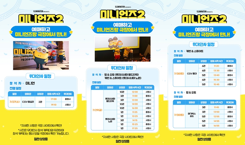 À̹ø¿¡ ÁøÇàµÉ ¾ÞÄÝ ¹«´ëÀλç´Â 27ÀÏ CGV ¿Õ½Ê¸® ½ÃÀÛÀ¸·Î 29ÀÏ ·Ôµ¥½Ã³×¸¶ ¿ùµåŸ¿ö, ·Ôµ¥½Ã³×¸¶ ³ë¿ø, 30ÀÏ CGV È«´ë, ¸Þ°¡¹Ú½º ¼Ûµµ¿¡¼ ÁøÇàµÈ´Ù. °ü°´µé°úÀÇ Æ¯º°ÇÑ Ãß¾ïÀ» À̾°¥ ¡®¹Ì´Ï¾ðÁî2¡¯ÀÇ ¾ÞÄÝ ¹«´ëÀλç´Â °¢ ±ØÀå ȨÆäÀÌÁö¿Í ¾ÛÀ» ÅëÇØ ¿¹¸ÅÇÒ ¼ö ÀÖ´Ù.