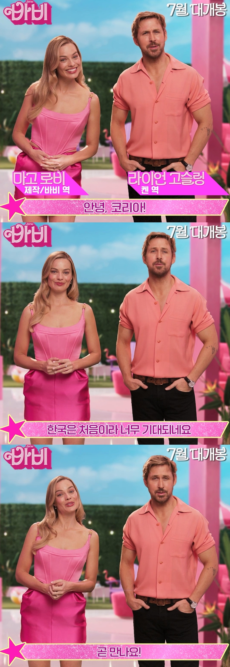 ÀÌ¿Í ÇÔ²² '¹Ùºñ'ÀÇ ÁÖ¿ª ¸¶°í ·Îºñ¿Í ¶óÀ̾ð °í½½¸µÀÌ ¿ÀÁ÷ Çѱ¹ ÆÒ ¸¸À» À§ÇÑ Æ¯º° ÀÎ»ç ¿µ»óÀ» º¸³»¿Í À̸ñÀ» ÁýÁß½ÃŲ´Ù. À̵éÀº ¡°ÇÏÀÌ ÄÚ¸®¾Æ!¡±¶ó¸ç ¿µÈ­ ¼Ó ¡®¹Ùºñ¡¯ÀÇ ½Ã±×´Ïó ´ë»çó·³ À¯ÄèÇÑ Àλ縦 °Ç³Ùµ¥ À̾î Çѱ¹À» ¹æ¹®ÇÑ´Ù´Â ¼Ò½ÄÀ» Á÷Á¢ ÀüÇß´Ù. ¸¶°í ·Îºñ´Â Çѱ¹ ÆÒµé°úÀÇ Ã¹ ¸¸³²À» ¾ÕµÎ°í ¡°Çѱ¹ÀÇ ¸ðµç ¡®¹Ùºñ¡¯¿Í ¡®ÄË¡¯À» ¸¸³ª·¯ °£´Ù¡±¶ó¸ç ¼³·½ °¡µæÇÑ ¼Ò½ÄÀ» ÀüÇØ ±¹³» ÆÒµéÀÇ ±â´ë°¨À» ´õ¿í °íÁ¶½ÃŲ´Ù.