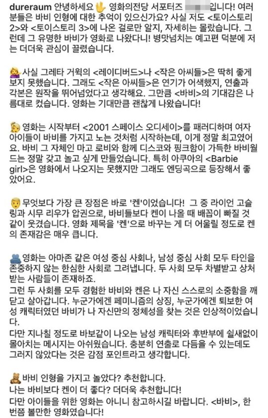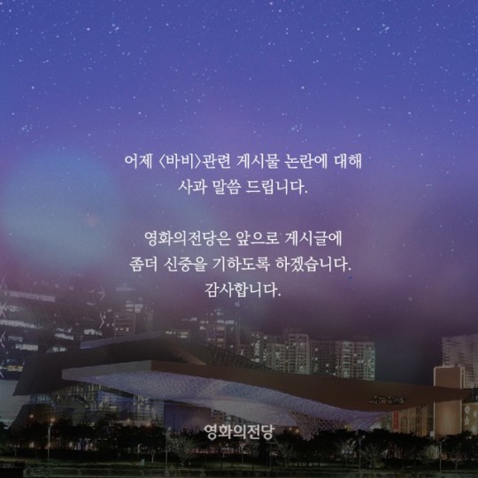 ¿µÈ­ÀÇ Àü´çÀº 21ÀÏ °ø½Ä ÀνºÅ¸±×·¥À» ÅëÇØ ¡°¾îÁ¦ ¡®¹Ùºñ¡¯ °ü·Ã °Ô½Ã¹° ³í¶õ¿¡ ´ëÇØ »ç°ú ¸»¾¸ µå¸°´Ù¡±¸é¼­ ¡°¿µÈ­ÀÇ Àü´çÀº ¾ÕÀ¸·Î °Ô½Ã±Û¿¡ Á» ´õ ½ÅÁßÀ» °¡Çϵµ·Ï Çϰڴ١±¶ó´Â ±ÛÀ» °ÔÀçÇß´Ù.