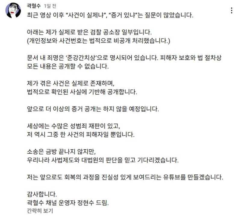 °ûÇ÷¼ö´Â Áö³­ 6ÀÏ ÀÚ½ÅÀÇ À¯Æ©ºê Ä¿¹Â´ÏƼ¿¡ "ÃÖ±Ù ¿µ»ó ÀÌÈÄ '»ç°ÇÀÌ ½ÇÁ¦³Ä' 'Áõ°Å ÀÖ³Ä'´Â Áú¹®ÀÌ ¸¹¾Ò´Ù"¶ó¸ç ÀÚ½ÅÀÌ ¹ÞÀº °ËÂû °ø¼ÒÀå ÀϺθ¦ °ø°³Çß´Ù. ¹®¼­ ³» Á˸íÀº 'Áذ­°£Ä¡»ó'À¸·Î ¸í½ÃµÅ ÀÖ´Ù.