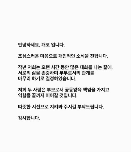 °³ÄÚ´Â 16ÀÏ ÀÚ½ÅÀÇ ÀνºÅ¸±×·¥ ½ºÅ丮¿¡ ¡°Á¶½É½º·¯¿î ¸¶À½À¸·Î °³ÀÎÀûÀÎ ¼Ò½ÄÀ» ÀüÇÑ´Ù¡±¶ó¸ç ¡°ÀÛ³â ÀúÈñ´Â ¿À·£ ½Ã°£ µ¿¾È ¸¹Àº ´ëÈ­¸¦ ³ª´« ³¡¿¡ ¼­·ÎÀÇ »îÀ» Á¸ÁßÇÏ¸ç ºÎºÎ·Î¼­ÀÇ °ü°è¸¦ ¸¶¹«¸® Çϱâ·Î °áÁ¤Çß´Ù¡±¶ó°í ¹àÇû´Ù.