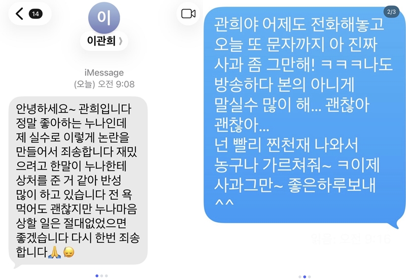 °ø°³µÈ ¹®ÀÚ¿¡¼­ À̰üÈñ´Â "Á¤¸» ÁÁ¾ÆÇÏ´Â ´©³ªÀε¥ Á¦ ½Ç¼ö·Î ÀÌ·¸°Ô ³í¶õÀ» ¸¸µé¾î¼­ Á˼ÛÇÏ´Ù. Àç¹ÕÀ¸·Á°í ÇÑ ¸»ÀÌ ´©³ªÇÑÅ× »óó¸¦ ÁØ °Å °°¾Æ ¹Ý¼º ¸¹ÀÌ Çϰí ÀÖ´Ù. Àú´Â ¿å ¸Ô¾îµµ ±¦ÂúÁö¸¸ ´©³ª ¸¶À½ »óÇÒ ÀÏÀº Àý´ë ¾ø¾úÀ¸¸é ÁÁ°Ú´Ù. ´Ù½Ã Çѹø Á˼ÛÇÏ´Ù"¶ó°í ÀüÇß´Ù.
