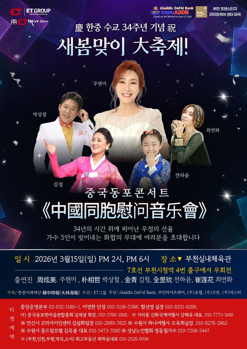 [¼¿·´¹Ìµð¾î ½Å¾Æ¶÷ ±âÀÚ] ÇÑÁß¼ö±³ 34ÁÖ³âÀ» ±â³äÇÏ´Â 'ÇÑÁß¼ö±³ 34Áֳ⠱â³ä »õº½¸ÂÀÌ ÓÞÃàÁ¦! Áß±¹µ¿Æ÷ Äܼ­Æ®'°¡ ¿À´Â 2026³â 3¿ù 15ÀÏ, ºÎõ ½Ç³»Ã¼À°°ü¿¡¼­ °³ÃֵȴÙ.