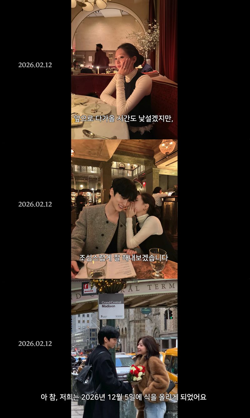 ¶ÇÇÑ ¡°5³âÀ» ¸¸³ª¸ç óÀ½ 2³âÀº ¸¶³É ÇູÇß°í, ±×´ÙÀ½ 2³âÀº ¼­·ÎÀÇ ´Ù¸§À» ¾Ë¾Æ°¡¸ç ¾ÆÇ ½Ã°£µµ ÀÖ¾ú´Ù. ¸¶Áö¸· 1³âÀº ÀÌÀ¯¸¦ ¼³¸íÇÒ ¼ö ¾øÀ» ¸¸Å­ ¼­·Î¸¦ ¾Æ³¢°í »ç¶ûÇÑ´Ù´Â È®½ÅÀÌ µé¾ú´Ù¡±¸ç ¡°ÀÚ¿¬½º·´°Ô ÇÔ²²ÇÏ´Â ¹Ì·¡¸¦ ±×¸®°Ô µÆ´Ù. ¾ÕÀ¸·ÎÀÇ ½Ã°£µµ Á¶½É½º·´°Ô Àß ÇØ³»º¸°Ú´Ù¡±°í ´ÙÁüÇß´Ù. µÎ »ç¶÷Àº ¿À´Â 2026³â 12¿ù 5ÀÏ °áÈ¥½ÄÀ» ¿Ã¸± ¿¹Á¤ÀÌ´Ù.