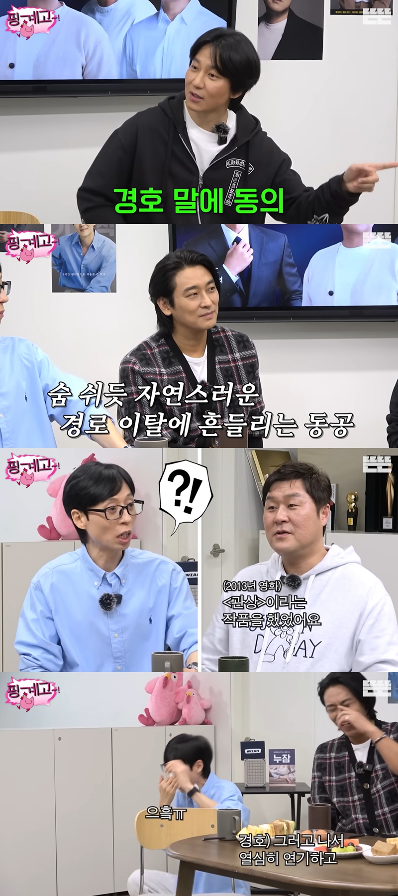 ¹° È帣µí °è¼ÓµÇ´Â À±°æÈ£ÀÇ ÅäÅ©¿Í °ø°¨°ú ¸®¾×¼ÇÀ¸·Î °Ý·ÁÇÏ´Â ±è³²±æ, 'TÀû ÅäÅ©'·Î ¸ÅÄÞÇÑ ¿ôÀ½À» ÁÖ´Â ÁÖÁöÈÆ±îÁö °³¼º ÀÖ´Â ÅäÅ© ½ºÅ¸ÀÏÀÌ ¸Å¹ø »õ·Î¿î ¿ôÀ½À» ÁÖ°í ÀÖ´Ù. ´©¸®²ÛµéÀº "ÁÖÁöÈÆÀº »ý°¢º¸´Ù ¸»ÀÌ ¾È ¸¹°í, ±è³²±æÀº »ý°¢¸¸Å­ ¸»ÀÌ ¸¹°í, À±°æÈ£´Â »ý°¢º¸´Ù ´õ ¸»ÀÌ ¸¹´Ù", "ÁÖÁöÈÆÀº ÇÒ ¸»Àº ÇØ¾ß Çϰí, ±è³²±æÀº ÇÏ°í ½ÍÀº ¸»Àº ÇØ¾ß Çϰí, À±°æÈ£´Â »ý°¢³ª´Â ´ë·Î ÇØ¾ß ÇÑ´Ù", "ÁÖÁöÈÆÀº ¸ÞŸÀÎÁö ÀßµÊ, ±è³²±æÀº ¸ÞŸÀÎÁö °ü½É ¾øÀ½, À±°æÈ£´Â ¸ÞŸÀÎÁö°¡ ¹ºÁö ¸ð¸§" µî ¼¼ »ç¶÷À» ºÐ¼®ÇÏ´Â Àç¹Ì¿¡ ºüÁ³´Ù.