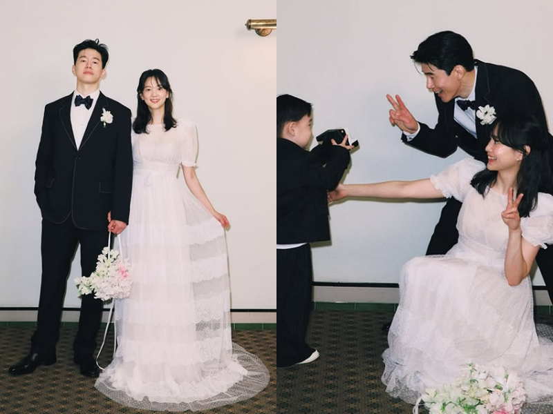 °ø°³µÈ »çÁøÀº ¸®¸¶ÀÎµå ¿þµù ÄܼÁÆ®·Î ÂïÈù °¡Á· »çÁøÀÌ´Ù. »çÁø ¼Ó¿¡´Â Åνõµ¸¦ Â÷·ÁÀÔÀº ±è¹«¿­°ú ÇÏ¾á µå·¹½º¸¦ ÀÔ°í ¹Ý¹­À½À» ÇÑ À±½Â¾ÆÀÇ ¸ð½ÀÀÌ ´ã°å´Ù. µÎ »ç¶÷Àº ²ÉÀÌ µç ¹Ù±¸´Ï¸¦ µé°í ¼ÕÀ» ¸¶ÁÖ ÀâÀº ä ȯÇÏ°Ô ¿ô°í ÀÖ´Ù.