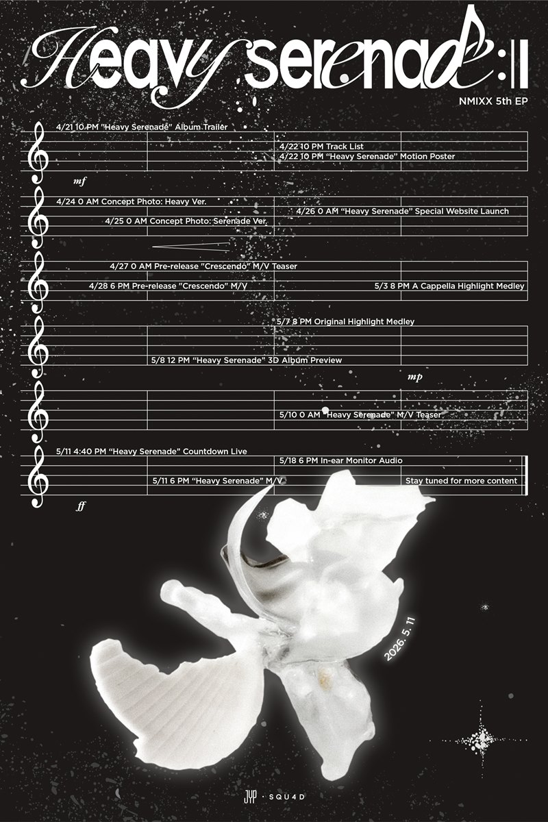À̹ø ½ºÄÉÁÙ·¯ À̹ÌÁö´Â 'Heavy Serenade'¶ó´Â ¾Ù¹ü¸íó·³ ¿À¼±º¸¿Í ³ôÀºÀ½ÀÚ¸®Ç¥, À½Ç¥, ¾Ç»ó±âÈ£ µîÀÌ ±×·ÁÁ® ³¶¸¸ÀûÀÎ ºÐÀ§±â¸¦ ÀÚ¶ûÇÑ´Ù. ÀÌ¿¡ µû¸£¸é NMIXX´Â 4¿ù 21ÀÏ ¾Ù¹ü Æ®·¹ÀÏ·¯¸¦ ½ÃÀÛÀ¸·Î 22ÀÏ Æ®·¢¸®½ºÆ®¿Í ¸ð¼Ç Æ÷½ºÅÍ, 24ÀÏ~25ÀÏ ÄܼÁÆ® Æ÷Åä, 26ÀÏ ½ºÆä¼È À¥»çÀÌÆ®, 5¿ù 3ÀÏ ¾ÆÄ«Æç¶ó ÇÏÀ̶óÀÌÆ® ¸Þµé¸®, 7ÀÏ ¿À¸®Áö³Î ÇÏÀ̶óÀÌÆ® ¸Þµé¸®, 8ÀÏ 3D ¾Ù¹ü ÇÁ¸®ºä¸¦ Â÷·Ê·Î ¿ÀÇÂÇÑ´Ù.
